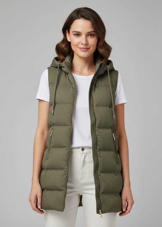 Damen Lange Steppweste mit Kapuze und Reißverschluss