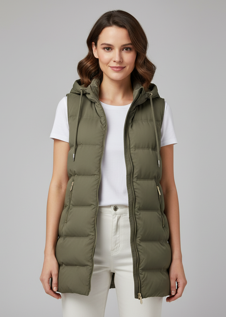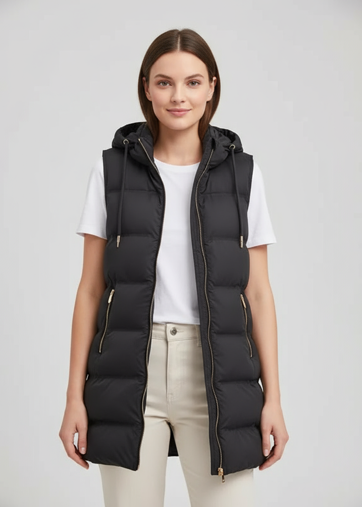 Damen Lange Steppweste mit Kapuze und Reißverschluss
