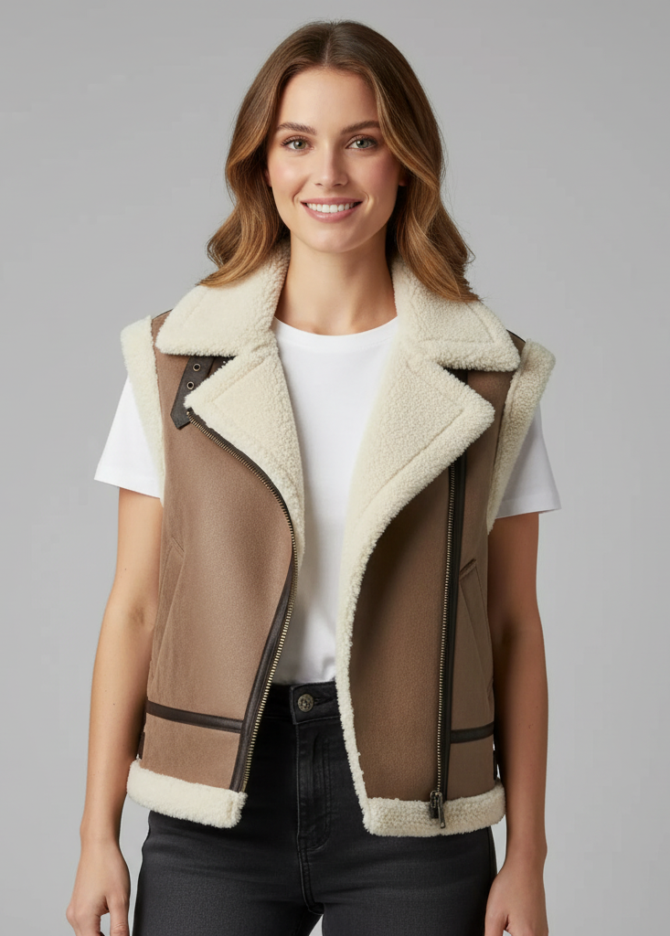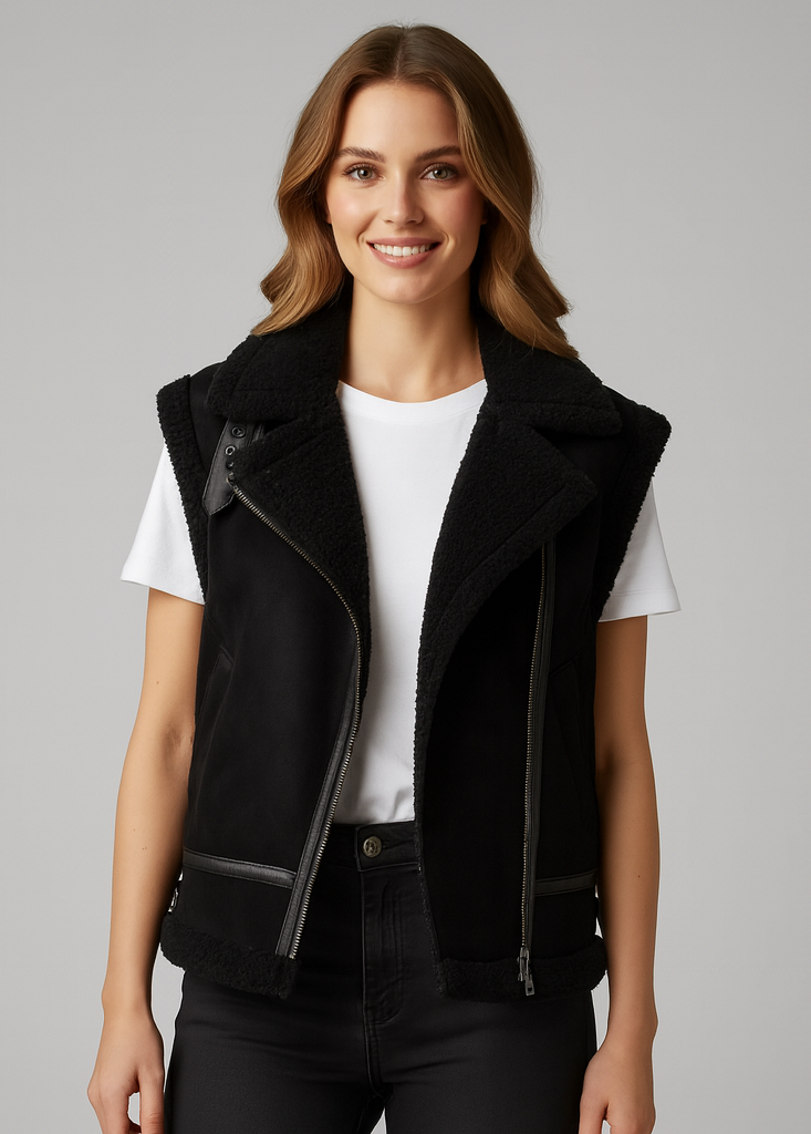Diese modische Teddyweste sorgt für einen trendigen Look und lässt sich ideal mit einem kurz- oder langärmeligen T-Shirt kombinieren. Der weiche Innenbereich und der markante Umlegekragen machen sie perfekt für kühle Übergangstage.