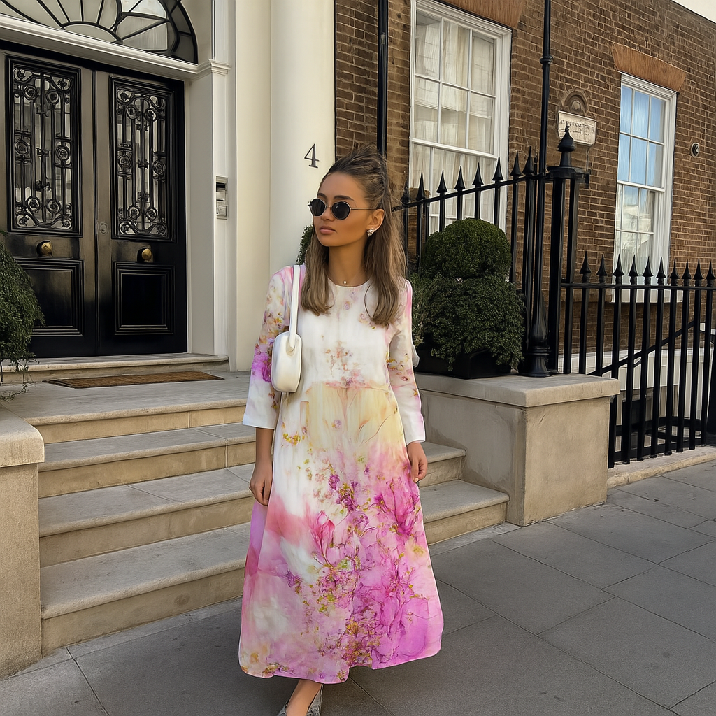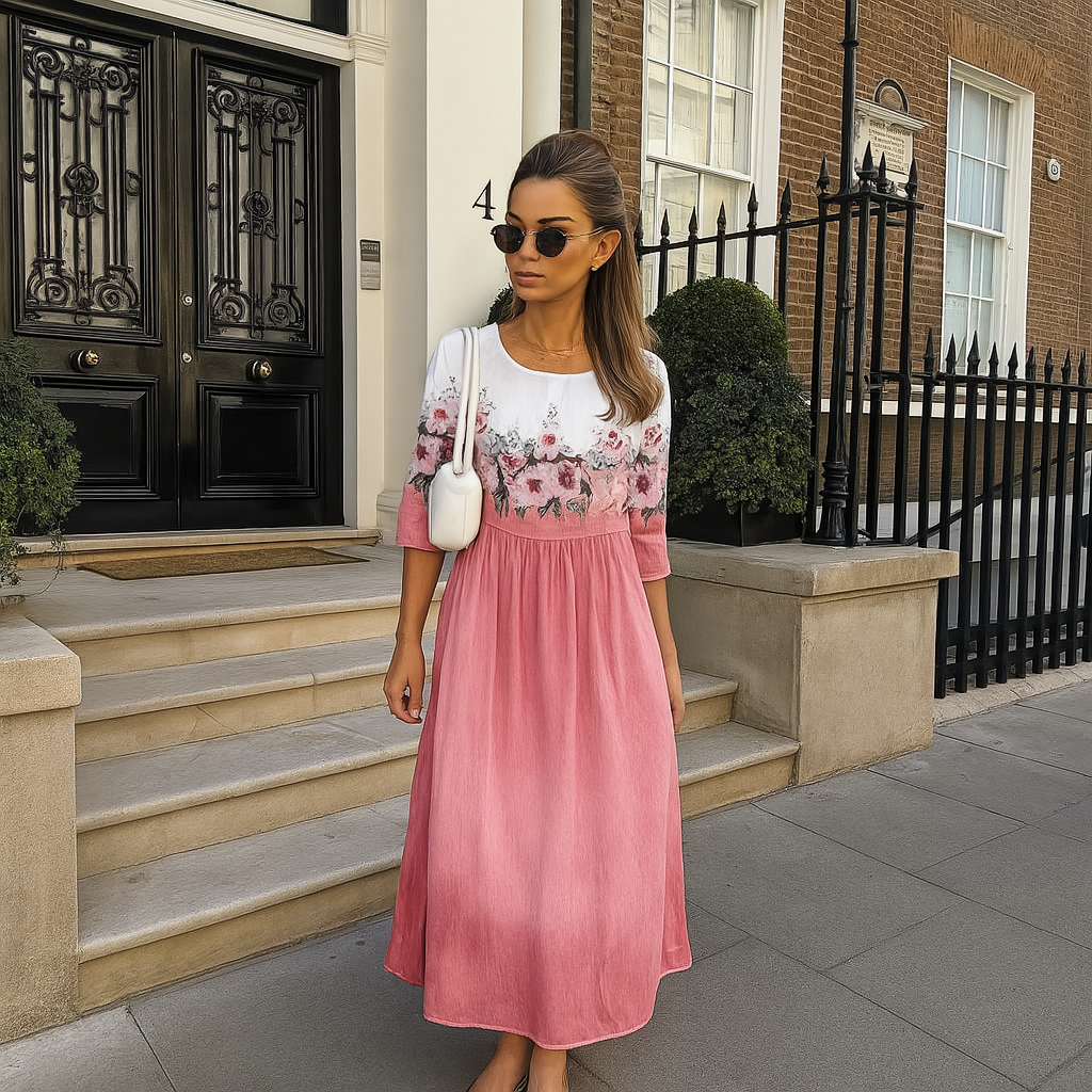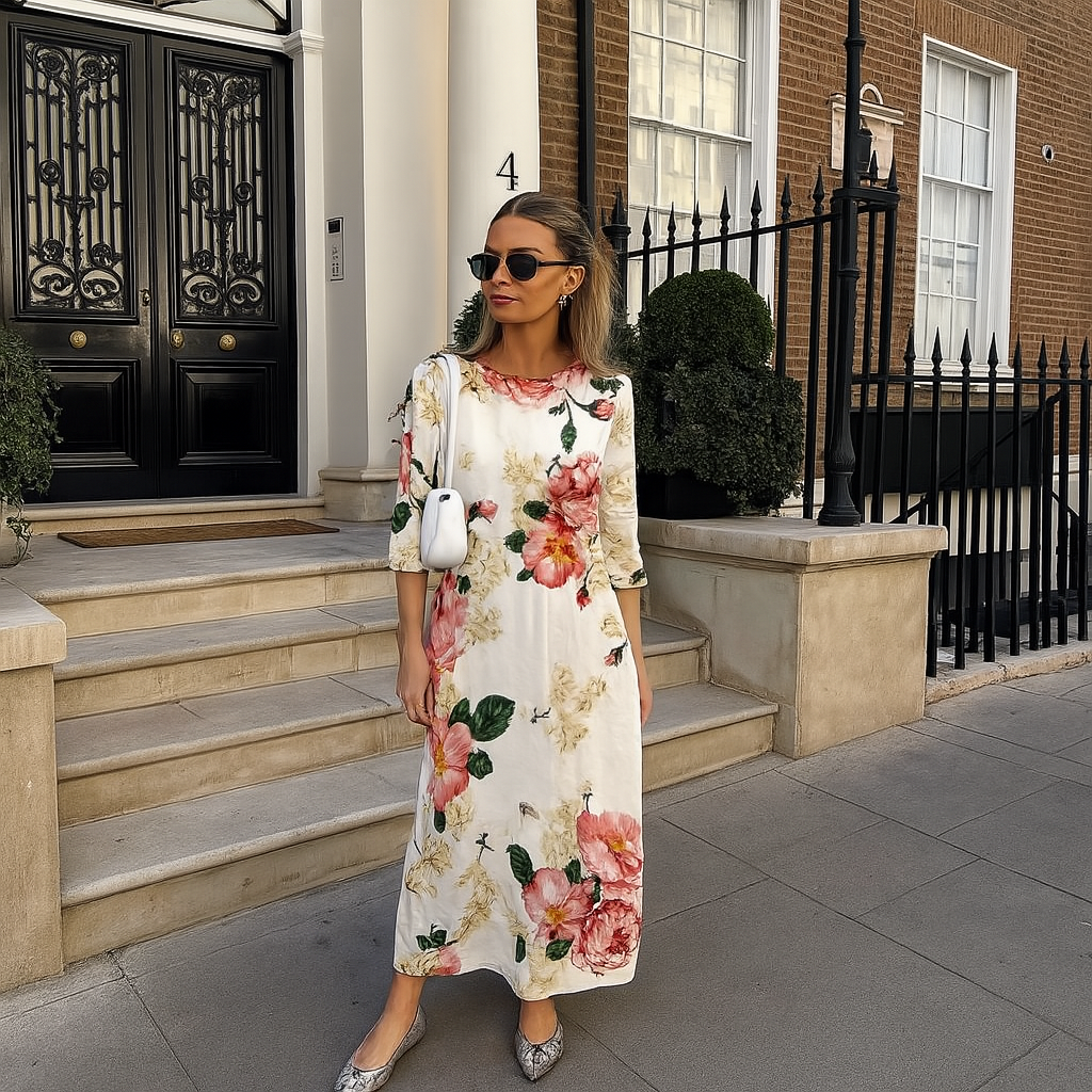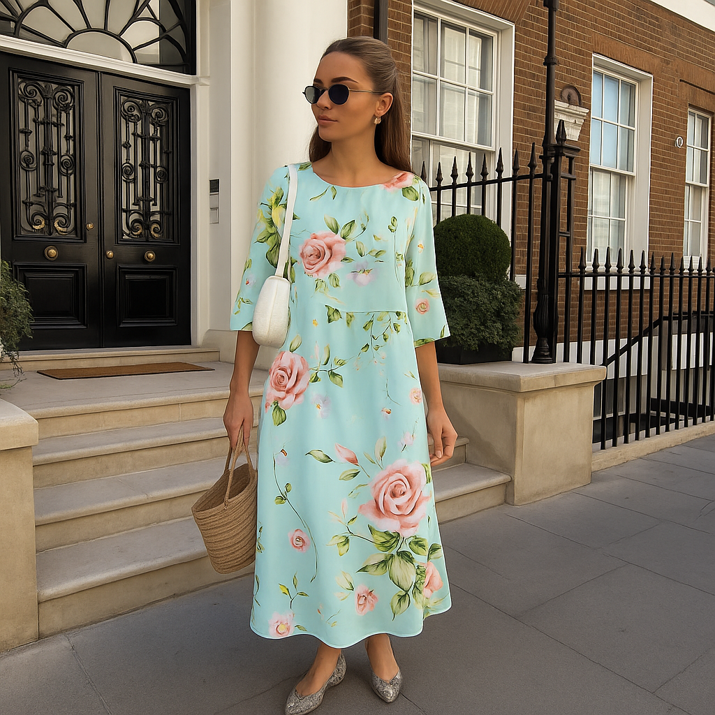 Erhöhen Sie Ihre Garderobe mit diesem eleganten Blumendruckkleid, das eine perfekte Mischung aus klassischem Stil und modernem Komfort bietet. Dieses Kleid wurde für Vielseitigkeit entworfen und eignet sich sowohl für formelle Veranstaltungen als auch für entspannte Ausflüge, sodass Sie immer hervorragend aussehen.