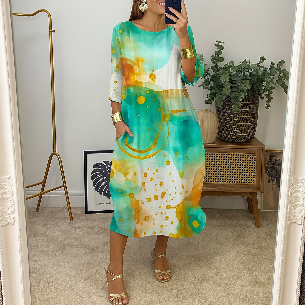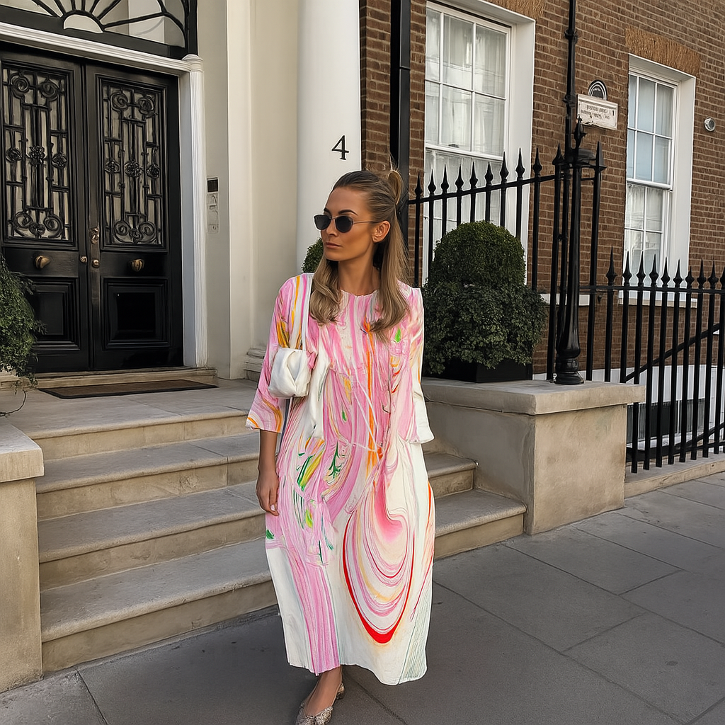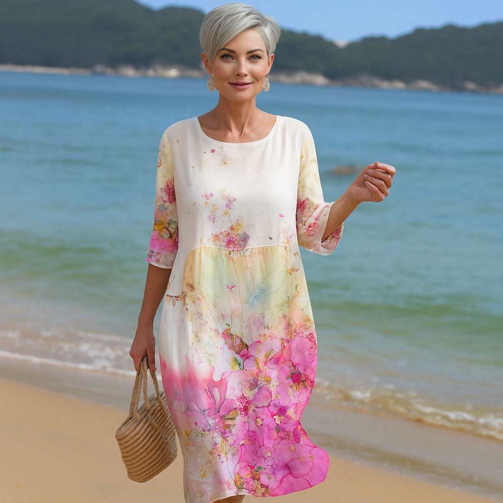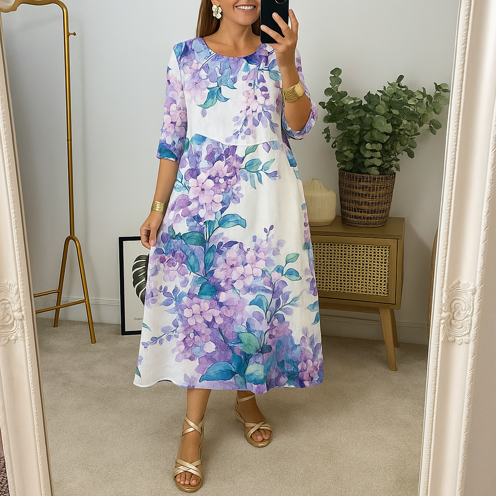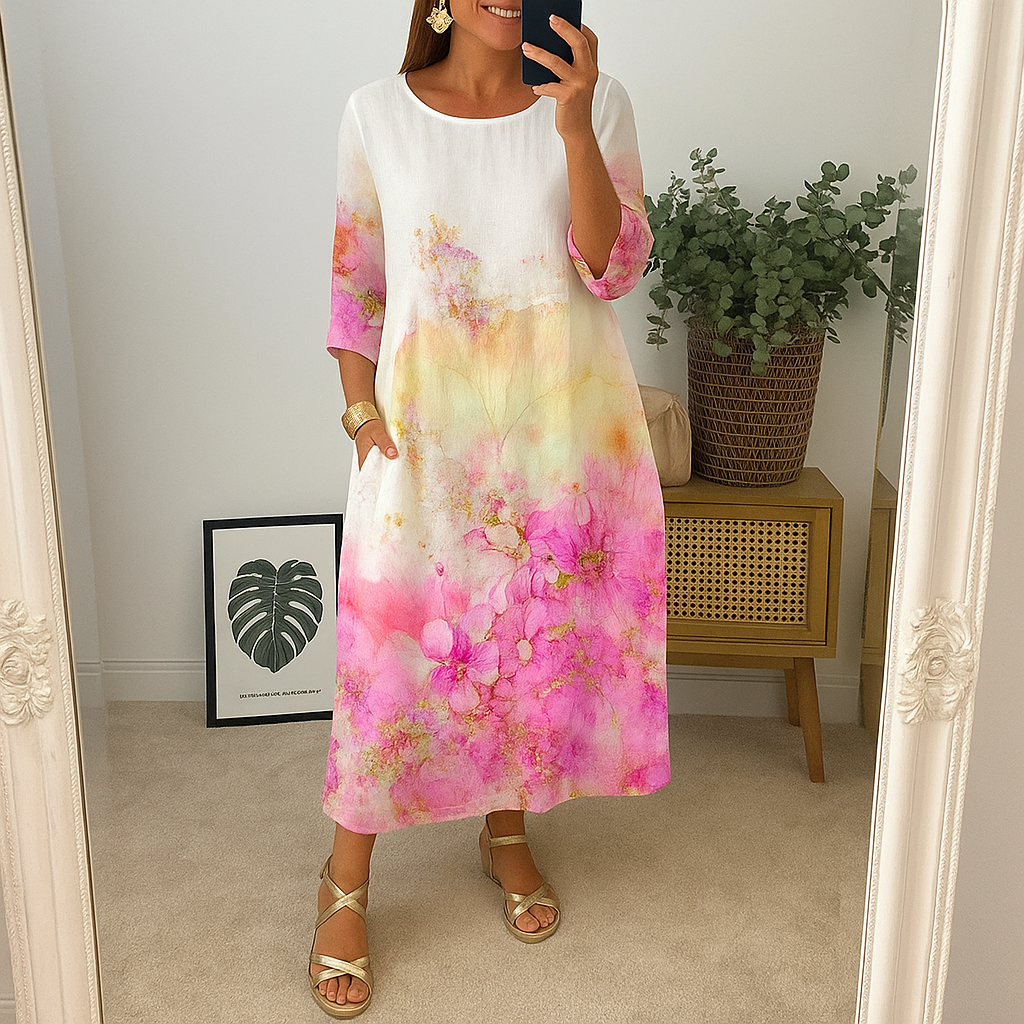 Erhöhen Sie Ihre Garderobe mit diesem eleganten Blumendruckkleid, das eine perfekte Mischung aus klassischem Stil und modernem Komfort bietet. Dieses Kleid wurde für Vielseitigkeit entworfen und eignet sich sowohl für formelle Veranstaltungen als auch für entspannte Ausflüge, sodass Sie immer hervorragend aussehen.